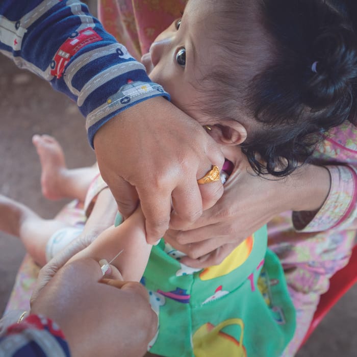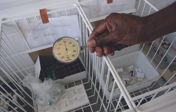 ワクチンは低温を保ったまま運ばないといけないので、電気がない地域まで届けるのは簡単ではありません。かつては電気がない地域でもつかえる灯油燃焼式の冷蔵庫がありましたが、ユニセフは1990年代から太陽光発電式のものを取り入れ、2010年には、バッテリーをつかわずに太陽光発電した電気だけでつかえる冷蔵庫を開発しました。再生可能エネルギーを活用した、安価で環境にもやさしい冷蔵庫の導入が進んでいます。