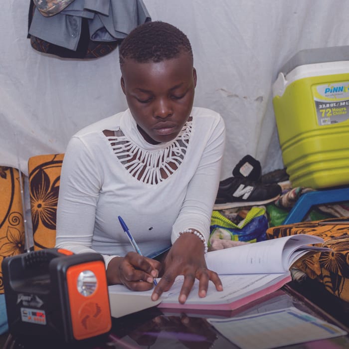 アフリカ最大のスラム街、ケニアのキベラ地区 。2020年、新型コロナウイルス感染症が広がり、16歳のセリーナさんの学校は8カ月以上も休校になりました。ほとんどの家庭に電気が通っていない貧困地域で、ユニセフは太陽光発電式のソーラーラジオと学習教材を配布。4万人の子どもたちがラジオで教育番組をききながら自宅で学習できるようになりました。また付属のライトのおかげで夜でも勉強ができるようになりました。