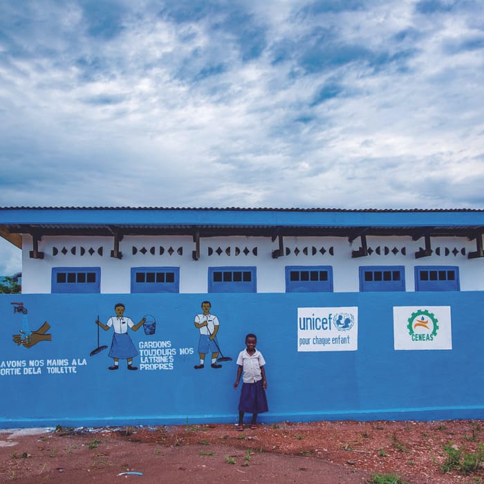 アフリカ大陸中央に位置するコンゴ民主共和国。長年続く紛争で校舎がこわされ、再開できずにいる学校がたくさんあります。教育が遅れると、子どもたちの将来に大きな影響が出ます。ユニセフは、学校をうしなった子どもたちがふたたび質の高い教育を受けられるよう、新しい教室とトイレを建設しました。校舎が完成するまでは仮設テントで勉強していた子どもたちも、ピカピカの教室にうれしそう。これからは思いっきり勉強できます。