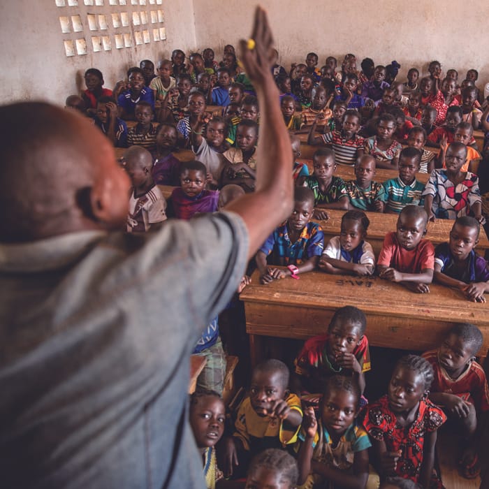 中央アフリカ共和国では、長いあいだ紛争が続き、たくさんの人が避難を強いられています。もともと足りていなかった学校の先生たちが、避難先から戻れなくなってしまい、教員不足が加速しています。この小学校では、200人もの子どもがひとつの教室でまなんでいて、全校生徒は2300人以上です。子どもたちは午前と午後の半分ずつに分かれて授業を受けていますが、資格を持った先生はたった5人。ユニセフは、先生の不足をおぎなうため、保護者や地域の人々にも研修をおこなって、臨時教員を養成しています。