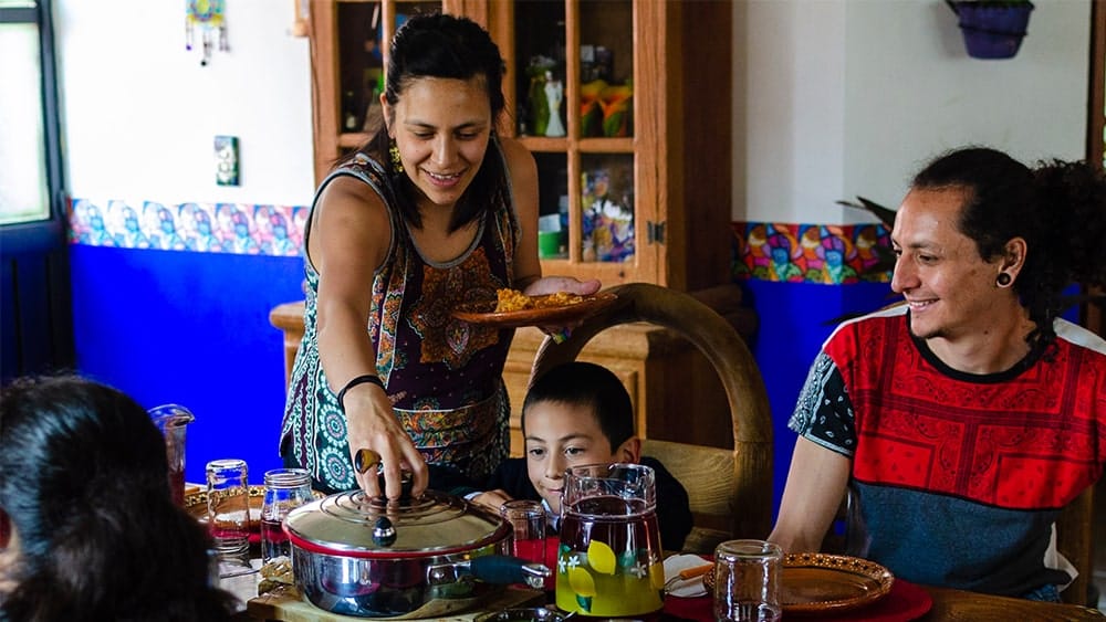 だれとたべる?:家族やホストファミリー、友だちといっしょにたべます。