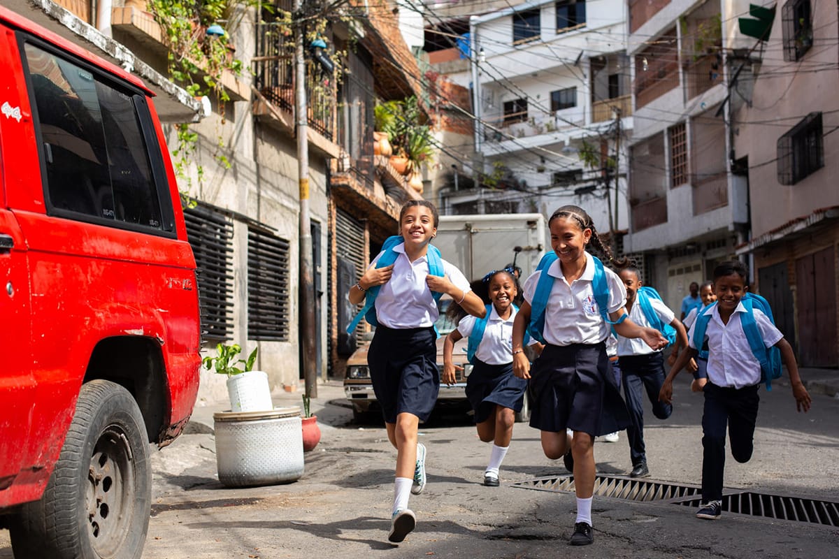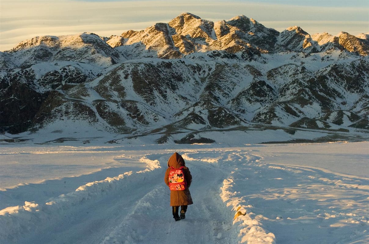 世界中のさまざまな場所に住む子どもたちが、学校に通う様子が、映し出されています。